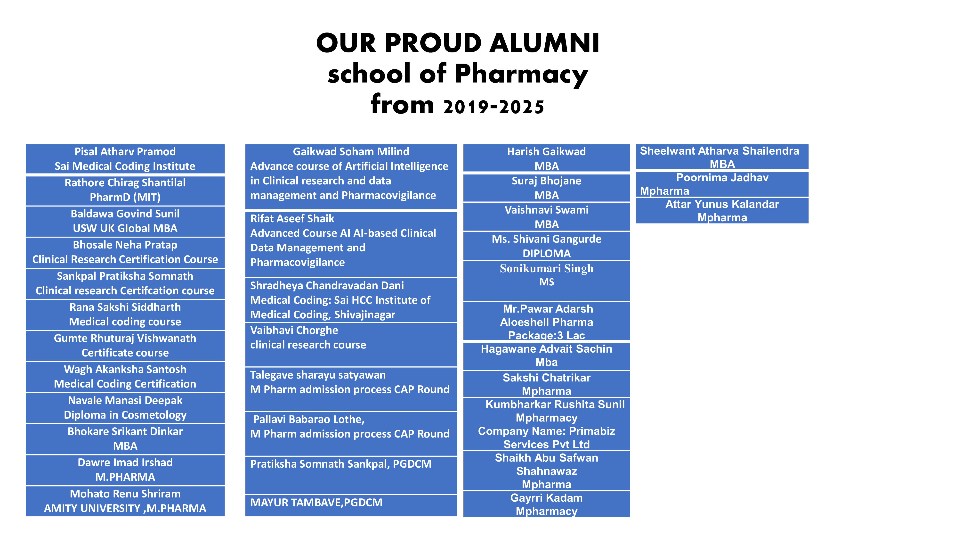 “A platform of knowledge and excellence means Vishwakarma University, School of Pharmacy. I believe that it is my best decision to be a part of Vishwakarma University. The most important factor about this institute is the infrastructure and teaching staff. Each and every faculty is a symbol of knowledge, passionate and bringing the best in each student. Along with teaching we also enjoy a lot of various co-curricular activities.