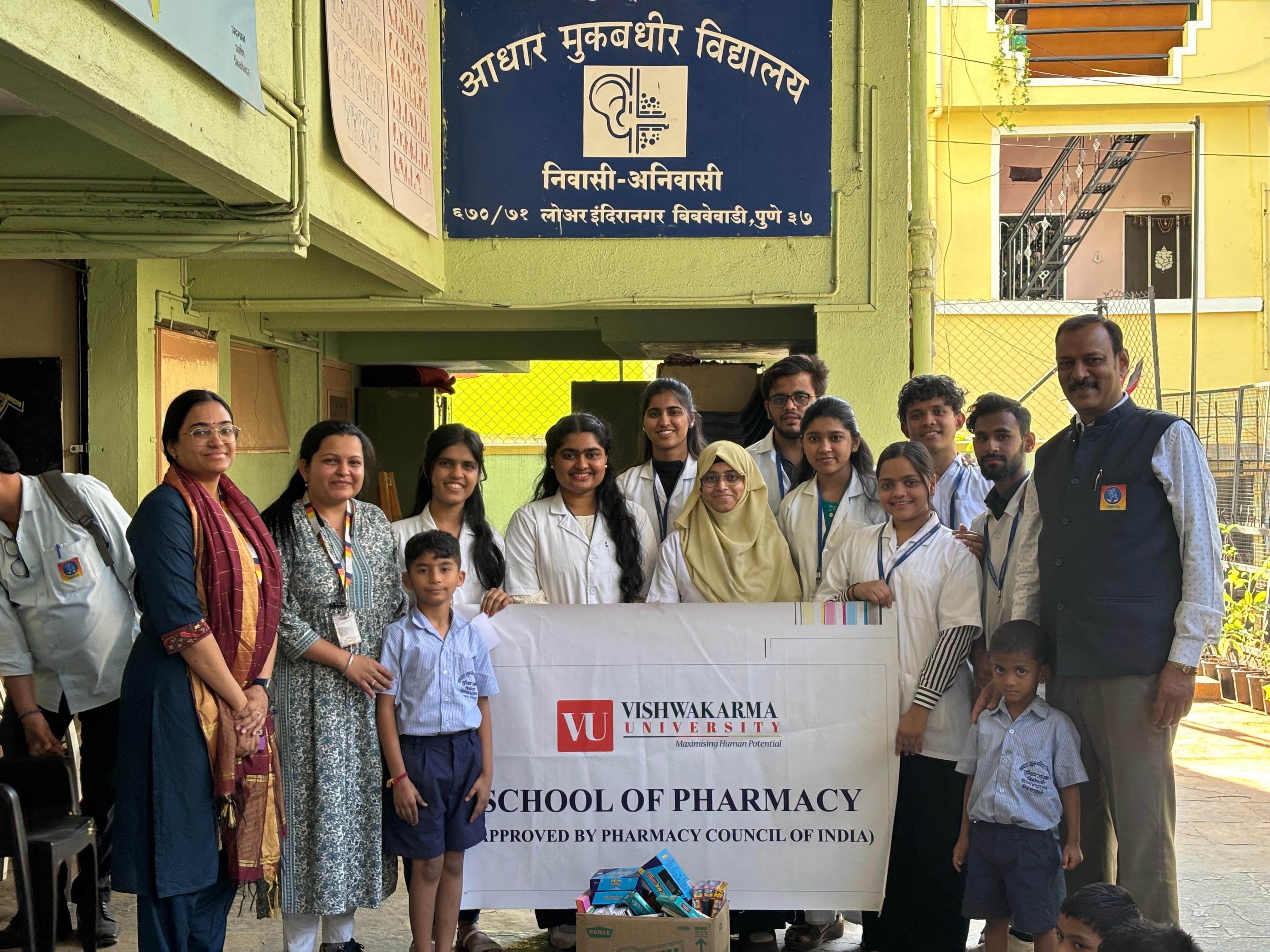 On 27 February 2026, the School of Pharmacy, Vishwakarma University, Pune, conducted a meaningful extension activity titled “Small Gestures, Healthy Futures – Hygiene and Nutrition Support & Awareness Activity” at Niwasi Adhar Muk Badhir Vidyalaya, Bibwewadi, Pune, a residential school for children with hearing and speech impairment. The initiative was designed to promote awareness about personal hygiene, nutrition, and healthy lifestyle practices among children with special needs while strengthening the institution’s commitment to community-oriented education and social responsibility. During the activity, faculty members and pharmacy students engaged with the children through visual demonstrations, interactive sessions, and simple communication methods, ensuring that key health messages were conveyed in an understandable and engaging manner. The session focused on the importance of hand hygiene, oral care, personal cleanliness, and balanced nutrition in maintaining overall well-being. To make the learning experience enjoyable and inclusive, fun and activity-based games related to hygiene and healthy habits were also organized, which the children enthusiastically participated in and greatly enjoyed. These games not only created a joyful atmosphere but also helped reinforce important health concepts in a playful and memorable way. As part of the extension activity, hygiene kits and educational stationery were distributed to support the children’s daily hygiene and educational needs. The initiative also provided pharmacy students with valuable exposure to real-world community engagement, inclusive communication, and service- oriented learning. Overall, the activity served as a meaningful effort toward promoting health awareness, inclusivity, and compassion, demonstrating how small gestures can contribute to building healthier and happier futures for children with special needs. The initiative was thoughtfully designed and coordinated by Dr. Dipali Talele and Prof. Yogita Shinde, who guided the students in conductinginteractive awareness sessions and fun-based learning activities for the children.
