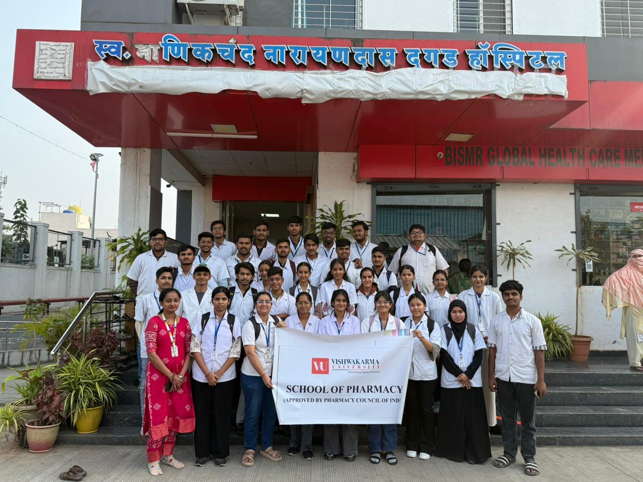 The Second Year Diploma in Pharmacy (AY 2025-2026) students from the School of Pharmacy, Vishwakarma University, Pune, visited BISMR Multispecialty Hospital, Bibwewadi, as a part of their academic curriculum to enhance practical learning and professional exposure. The visit aimed to familiarize students with real-time hospital operations, pharmacy management, and patient care practices. During the visit, students observed the functioning of various departments, including the outpatient, inpatient, ICU, NICU, dialysis centre and pharmacy sections. This experiential learning activity helped students bridge the gap between theoretical knowledge and practical application, promoting a deeper understanding of hospital pharmacy practices. The visit was organised and arranged by Prof. Archana Shaha.