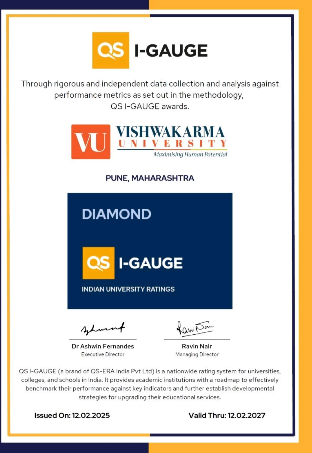 Vishwakarma University has been awarded the QS I-GAUGE Diamond Rating, a significant recognition of its excellence in higher education. This prestigious accolade places the university among the top institutions in India, highlighting its commitment to quality education, innovative teaching, and robust infrastructure."